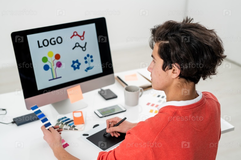 Молодой человек с цветовой палитрой создает логотип для веб-сайта перед компьютером