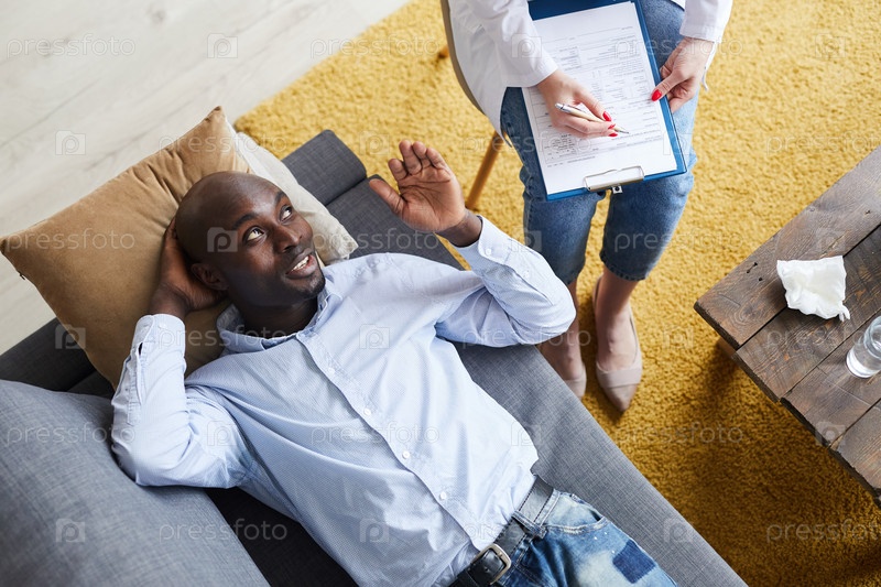 Сверху вид молодого афроамериканца в синей рубашке, лежащего на удобном диване и жестикулирующего руку, пока делится своей проблемой с психологом