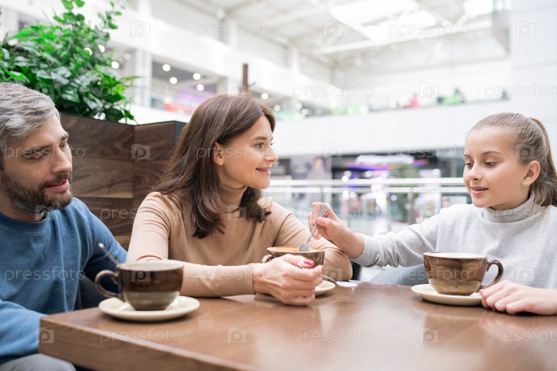 Красивая девушка со ложкой, принимающая пену капучино из чашки своей матери