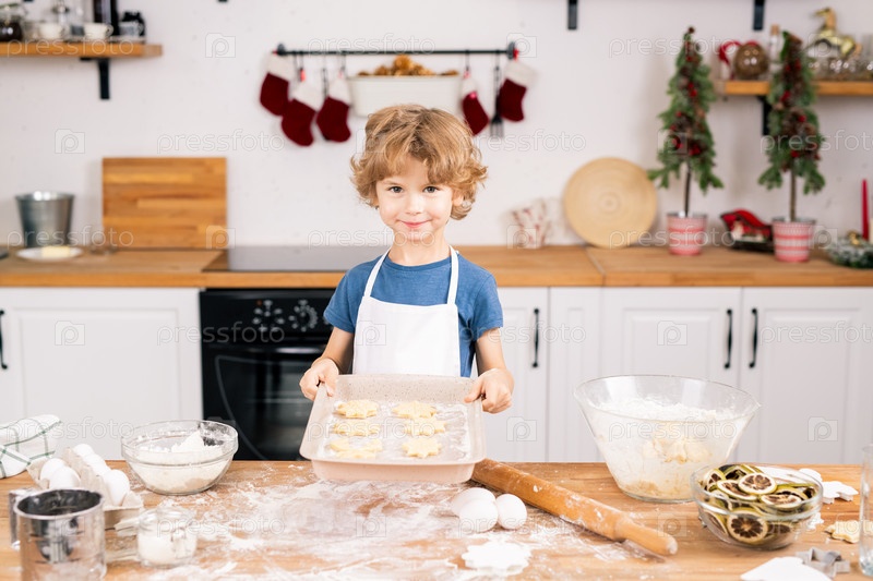 Счастливый милый мальчик с сырыми самодельными печеньками смотрит на тебя, когда ты стоишь за столом