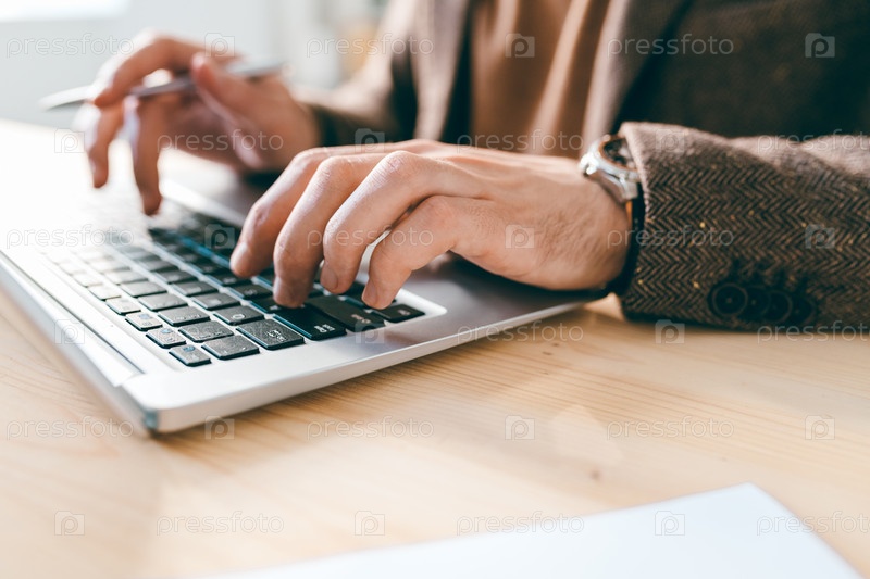Рука молодого мужского сотрудника или аналитика над клавиатурой ноутбука во время работы с данными