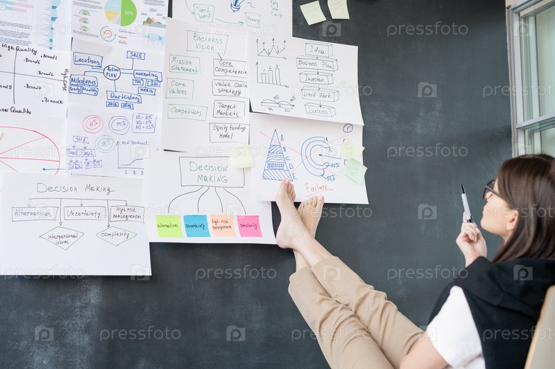 Молодая босоногая бизнесвуменка сидит перед доской и анализирует данные