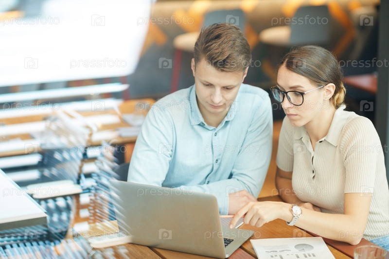 Сосредоточенные современные молодые коллеги сидят за столом в кафе с Wi-Fi и используют ноутбук, обсуждая бюджет