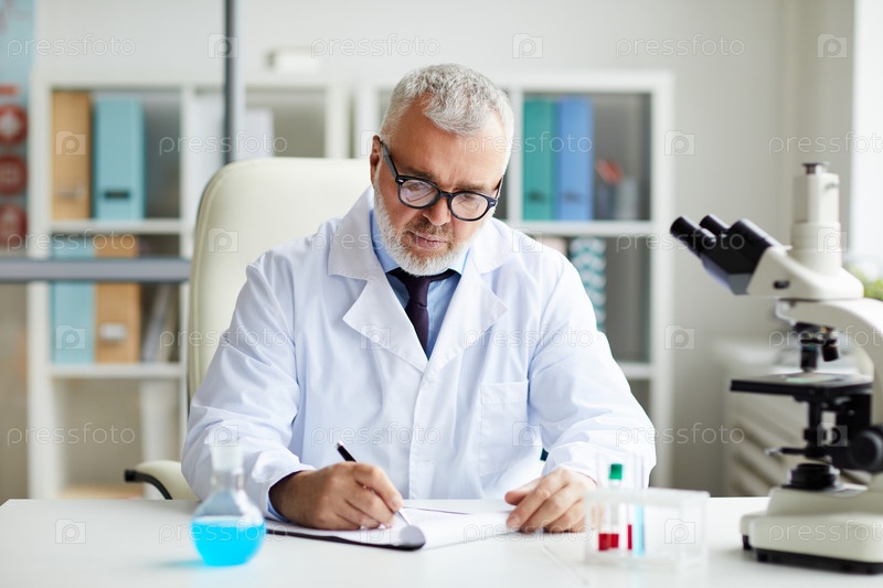 Старший ученый, работающий за столом