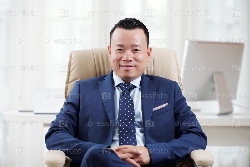 Успешный азиатский лидер сидит в офисе