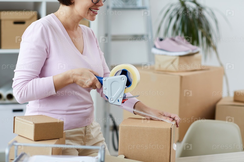 Онлайн-менеджер магазина с диспенсером ленточного пистолета уплотнительные коробки с заказами