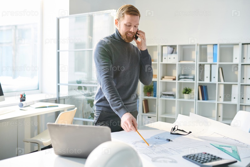 Веселый уверенный в себе красивый молодой архитектор в сером свитере стоит за столом и показывает чертеж карандашом, общаясь по мобильному телефону