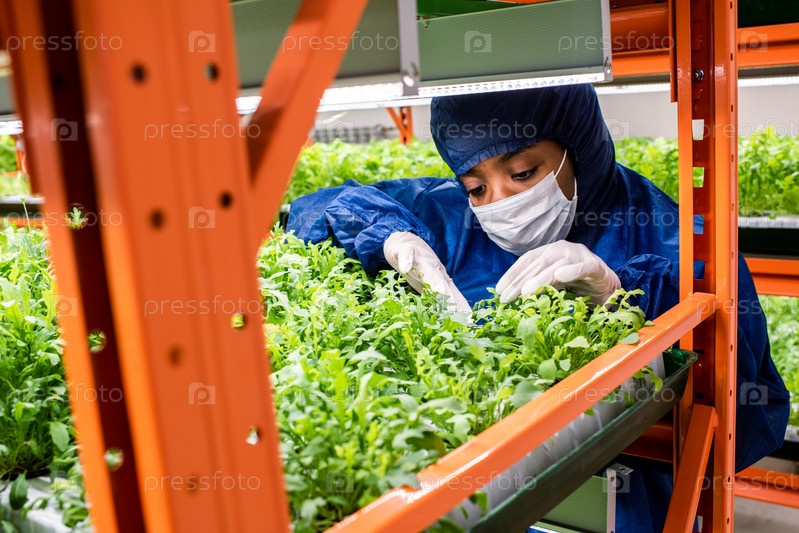 Молодой африканский исследователь в комбинезонах, маске и перчатках выбирает зеленые саженцы