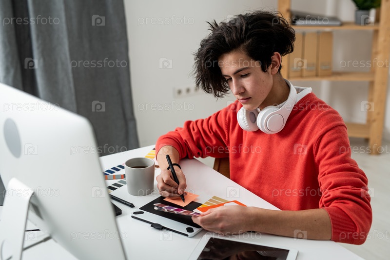 Молодой дизайнер домашнего офиса делает заметки и выбирает цвет из палитры