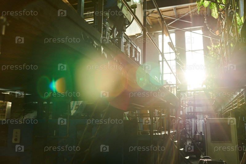 Промышленный производственный завод под солнечным светом: современная печатная пресса с рабочим мостом, эффект вспышки линзы