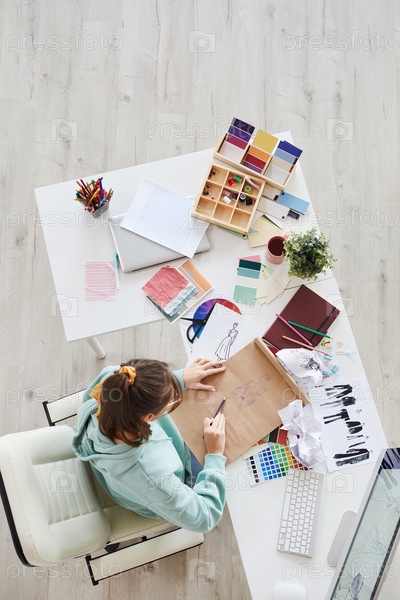 Вид сверху занятой молодой дизайнерки в зеленоватом капюшоне, сидящей за столом и работающей над эскизами платьев в студии