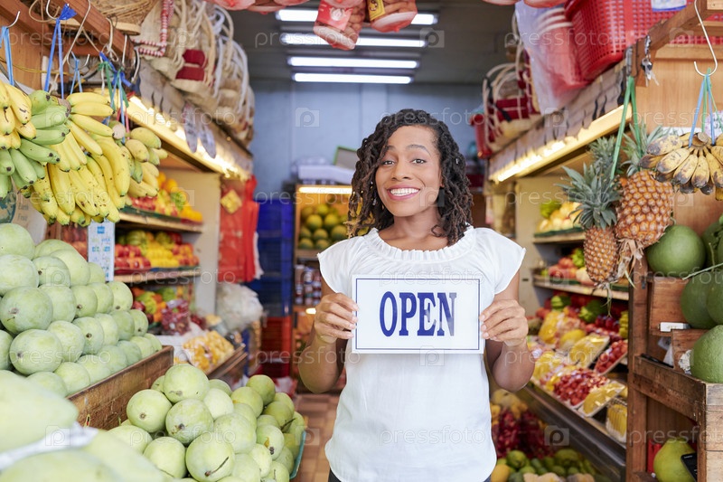 Счастливая женщина открывает продуктовый магазин