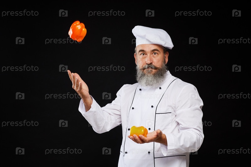 Старший шеф-повар жонглирует овощами