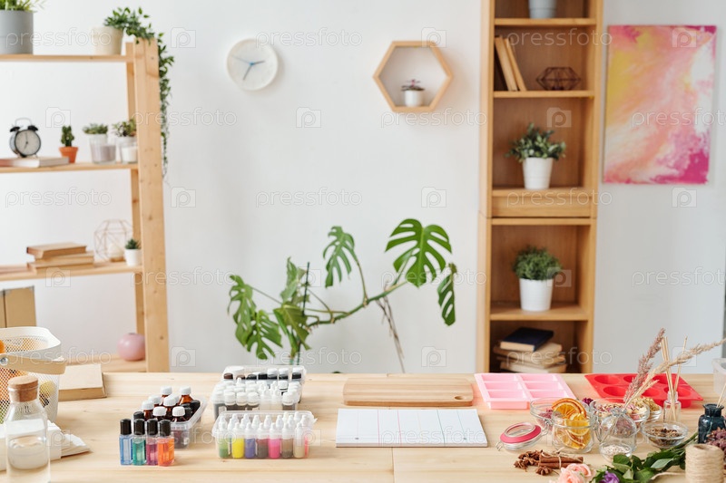 Рабочее место мылодела в студии с набором принадлежностей и оборудования на столе