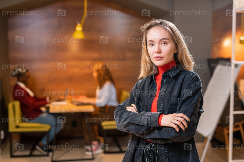 Красивая молодая, непринужденная блондинка-студентка со скрещенными руками смотрит на тебя
