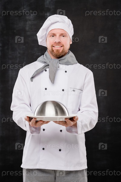 Молодой улыбающийся шеф-повар в форме, держащий колош с приготовленной едой для вас