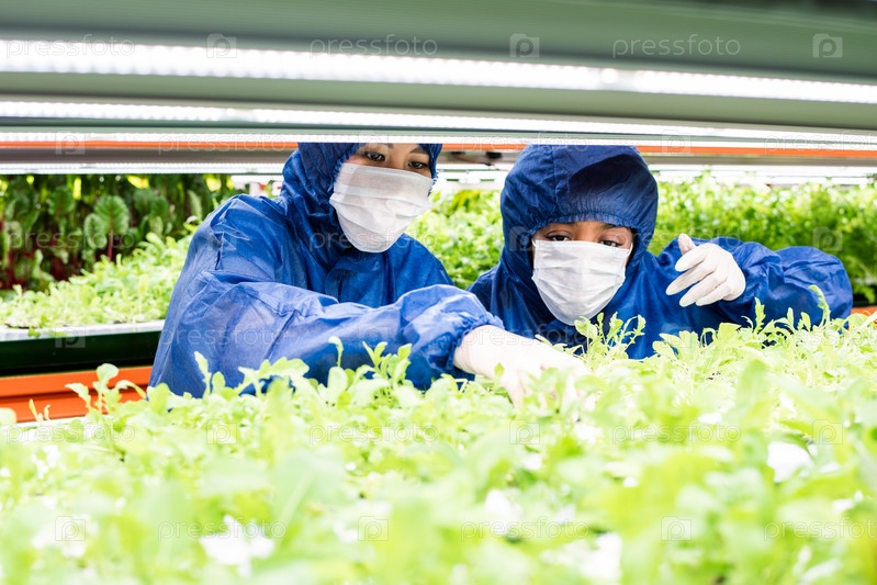 Двое работников теплицы в защитных комбинезонах смотрят сквозь зеленые саженцы