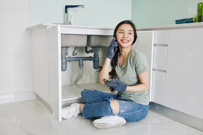 Женщина сама ремонтирует трубу