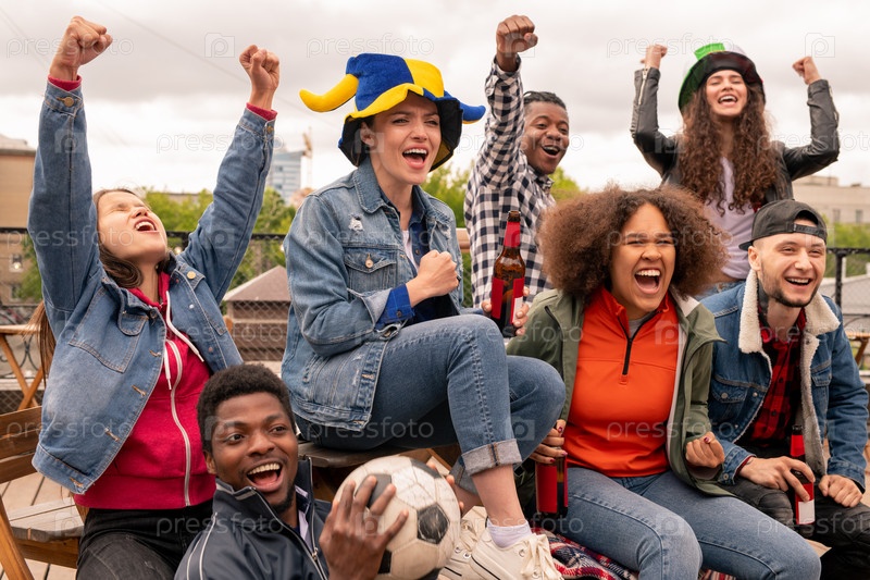 Молодые межкультурные футбольные болельщики с поднятыми руками аплодируют своей команде