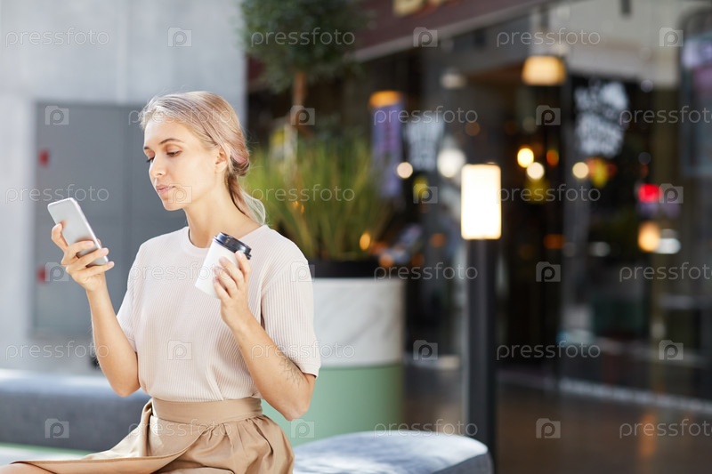 Серьезная привлекательная молодая женщина в модных одеждах сидит на скамейке в торговом центре и пьет кофе, пользуясь интернетом по телефону