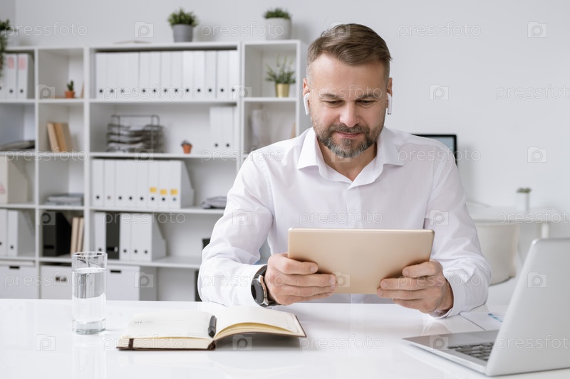 Серьезный бизнесмен с сенсорной панелью, смотрящий онлайн видеотренинги или конференции