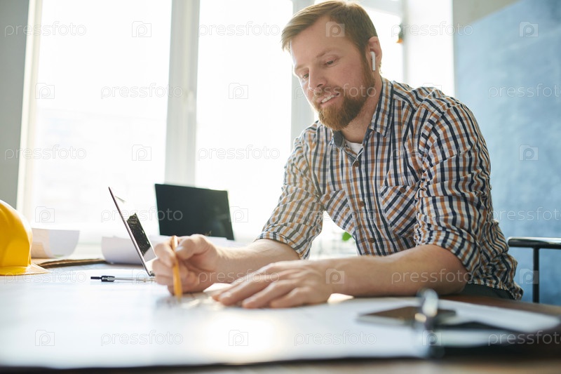 Позитивный занятый красивый молодой бородатый инженер в беспроводных наушниках сидит за столом и разрабатывает дизайн проекта