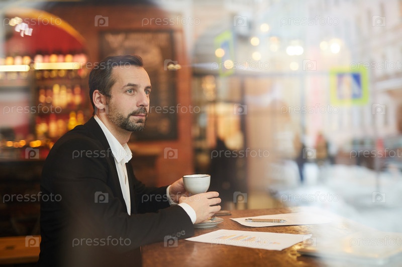 Уверенный бизнесмен наслаждается кофе в роскошном ресторане