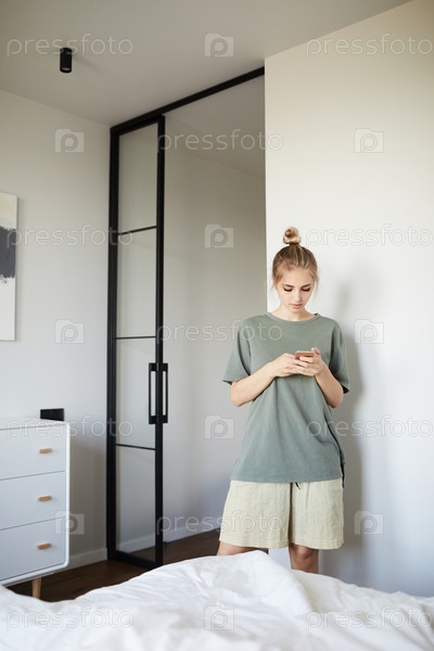 Красивая молодая случайная женщина прокручивает смартфон в спальне