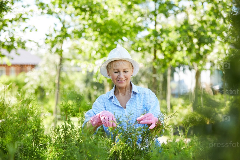 Старшая женщина, режущая кустарники