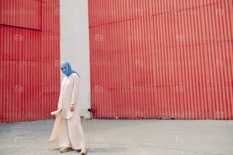 Молодая мусульманка в синем хиджабе и повседневной одежде на фоне стены снаружи