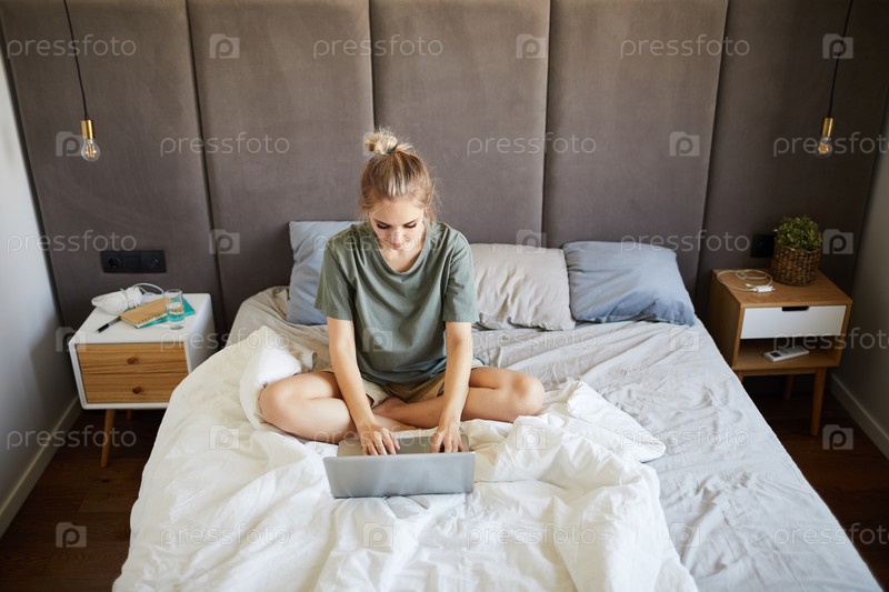Красивая девушка в обычной футболке сидит на кровати, печатая