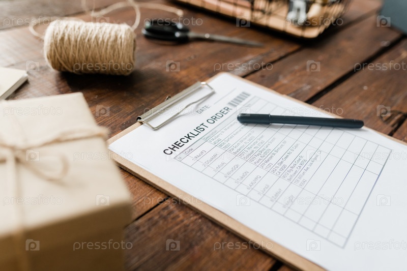 Клипборд с документом и ручкой, катушка из нитей, упакованная коробка и другие предметы