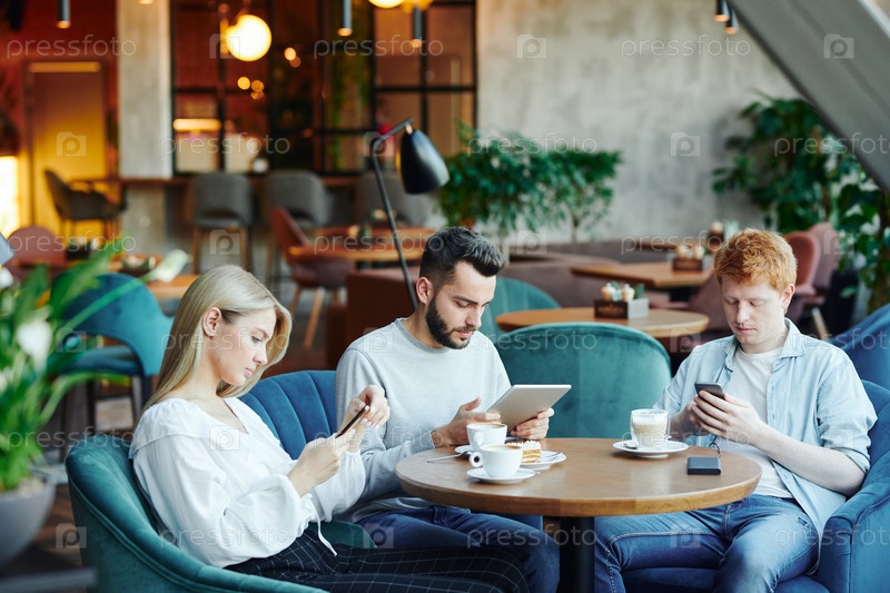 Блондинка и два парня сидят в креслах в кафе, прокручивая гаджеты