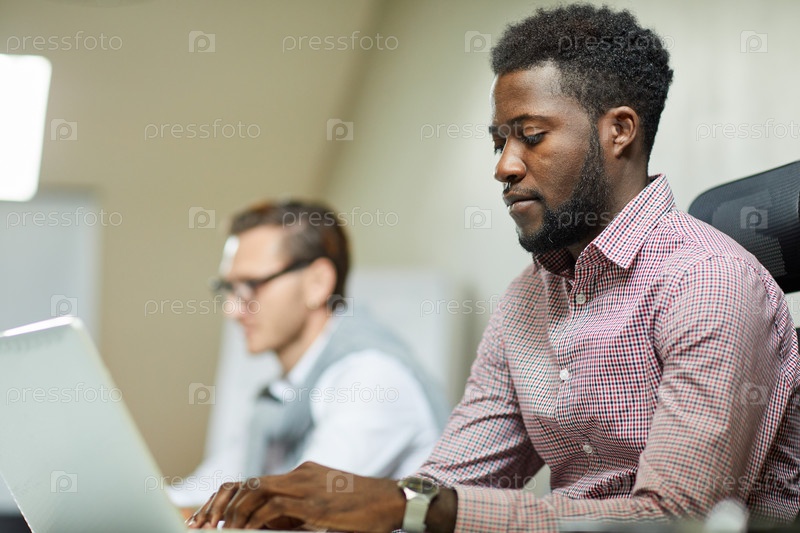 Концентрированный молодой афроамериканский программист в квадратной рубашке, сидящий за столом и печатающий на ноутбуке