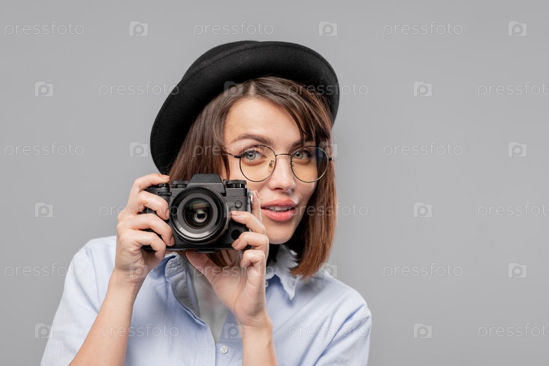 Красивая молодая женщина-фотограф с камерой, которая смотрит на тебя