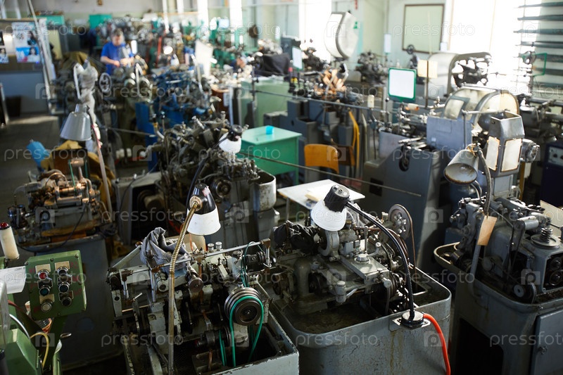 Общий вид часовой фабрики магазин полный машин с электрическими лампами, используемых для производства механизма часов и редукторов