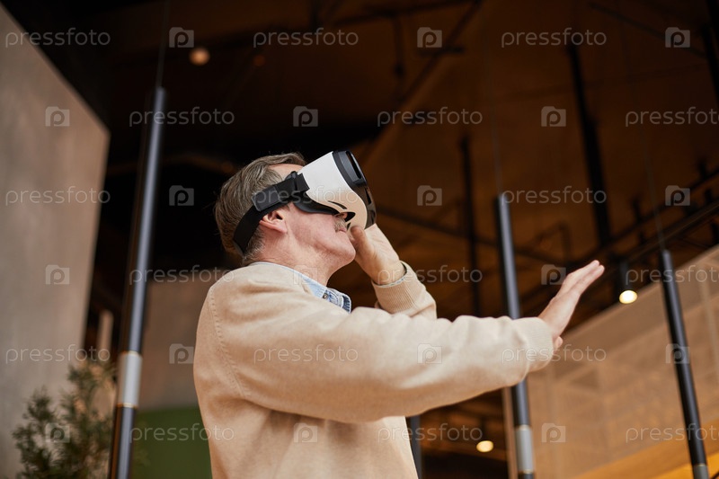 Ниже вид сконцентрированного старшего мужчины в очках виртуальной реальности, которые жестикулируют рукой во время видеоигр