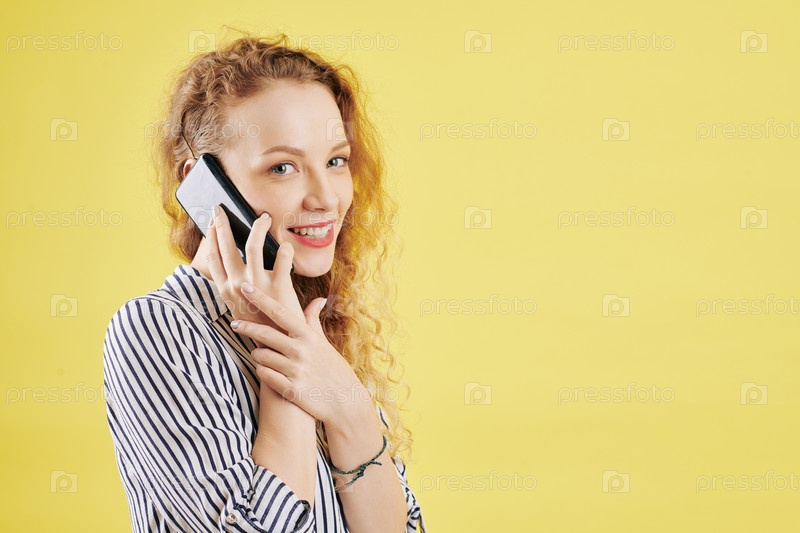 Веселая женщина делает телефонный звонок