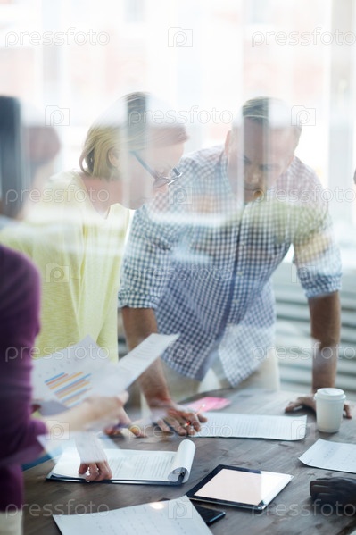 Серьезные обдуманные коллеги маркетинговой компании, стоящие за столом и просматривающие документы во время обсуждения стратегии