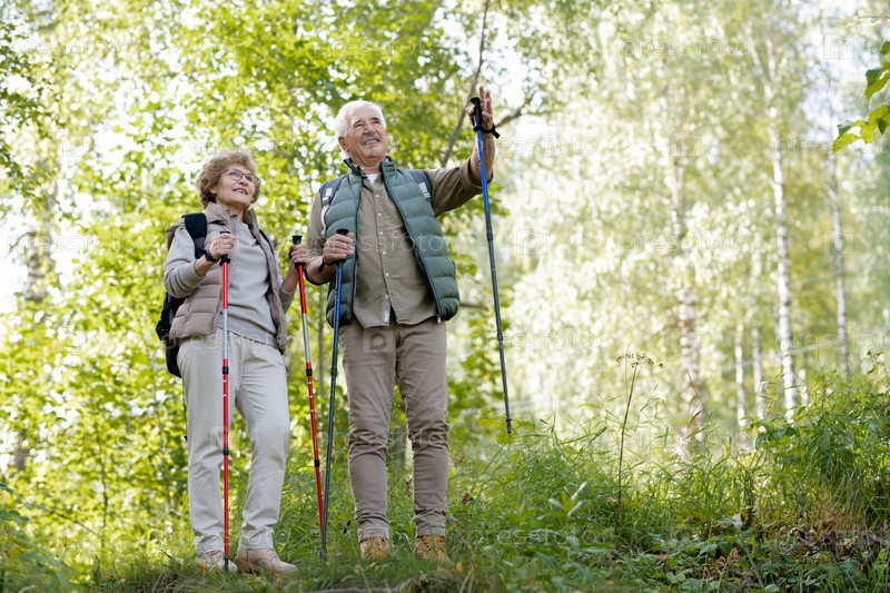 Счастливый старший мужчина показывает жене путь в лес