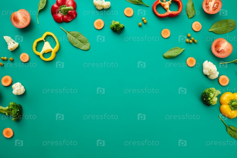 Различные свежие овощи, такие как помидоры, брокколи, горох, перец и листья на зеленом фоне