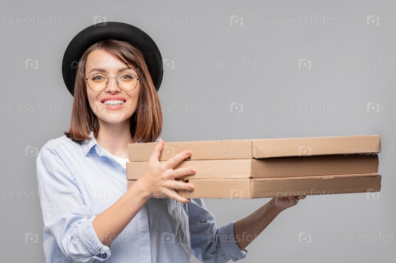 Счастливая девушка в шляпе, рубашке и очках держит кучу тонких картонных пакетов