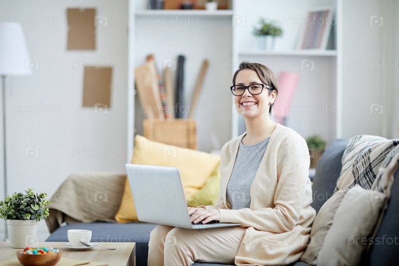 Улыбающаяся деловая женщина, использующая ноутбук