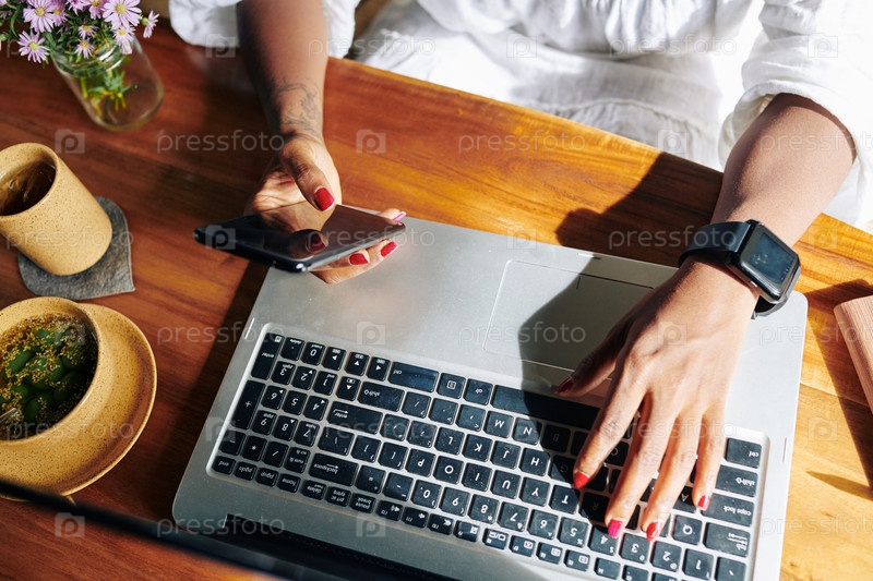 Женщина соединяет телефон с ноутбуком