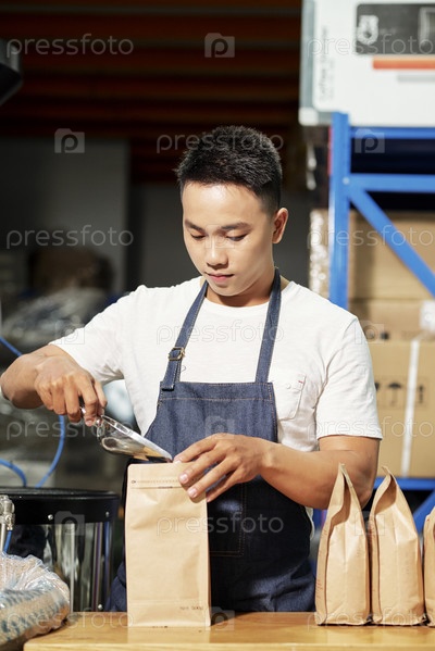 Мужчина упаковывает кофейные бобы на продажу