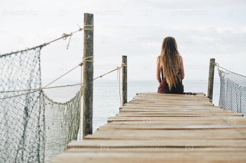 Пенсивная женщина на деревянном пирсе