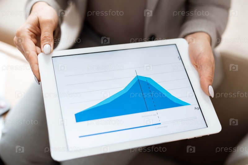 Руки агента по недвижимости, держащего планшет с синим финансовым графиком на дисплее