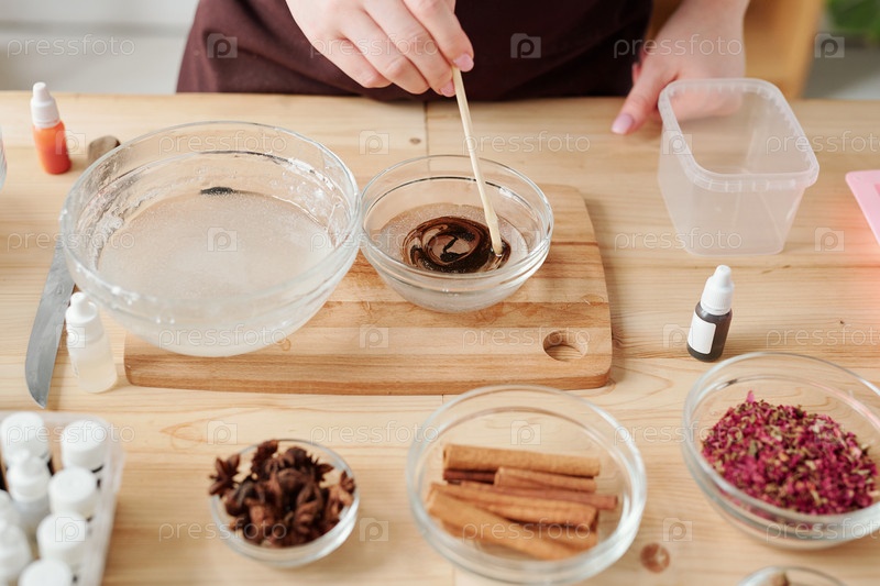 Руки женщины смешивают жидкую мыльную массу с шоколадной эсенцией в стеклянной посуде