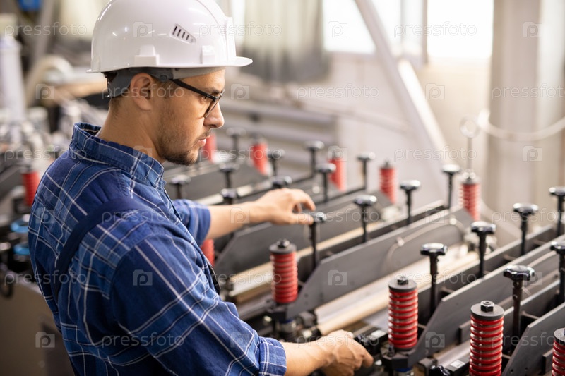 Серьезный молодой инженер или механик в hardhat, обслуживающий новое промышленное оборудование