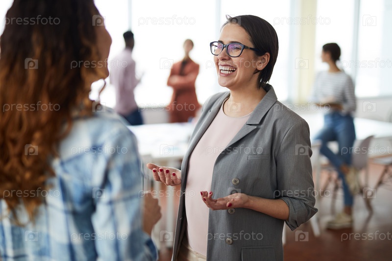 Улыбающаяся деловая женщина в разговоре с коллегой по работе